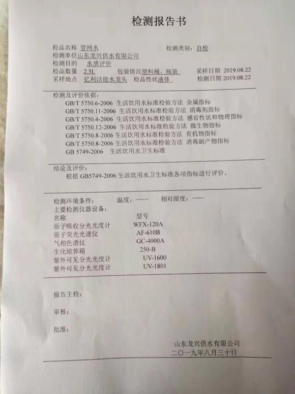 億利潔能水龍頭水質檢測報告